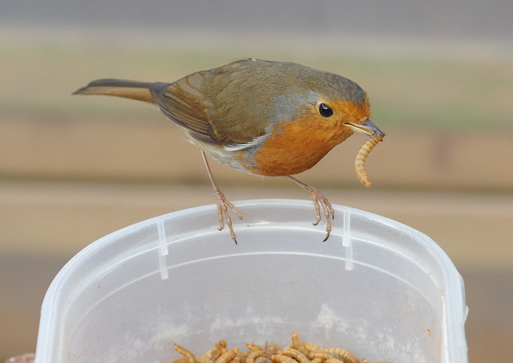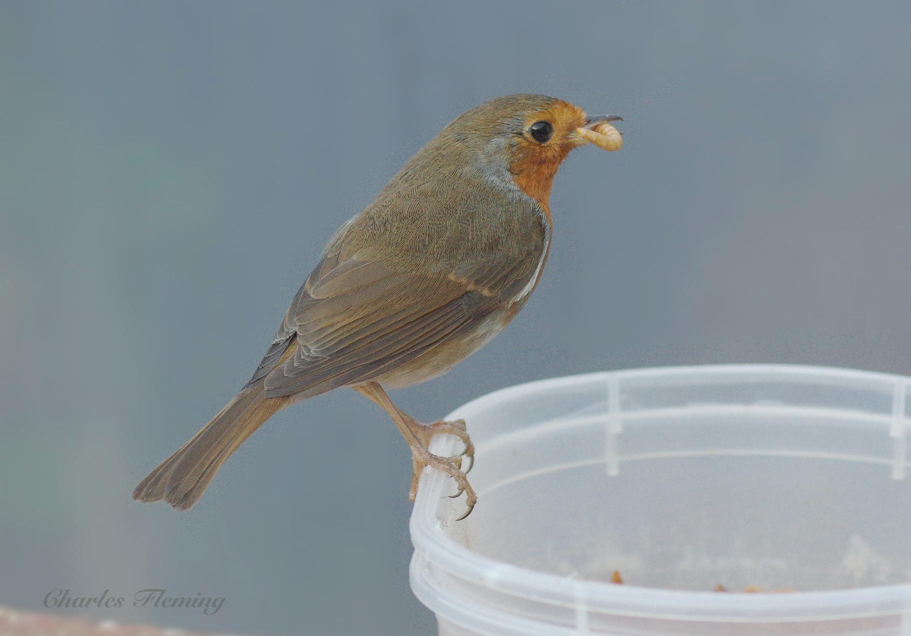 The Robins are doing great! It’s been really lovely to have them around my feet and even in my polytunnel amongst the plants. The female approached me yesterday and I thought she was looking for mealworms but instead she drank from the drip at the end of the hose pipe. We haven’t had serious rain for a while and I hadn’t realised that there is no standing water. The young chicks are about to leave the nest, perhaps today but if not within the next day or so. They are fully feathered and look very bright eyed and healthy. The parents continue to feed them constantly and come to take mealworms from me whenever I offer them. But now there is a new development. The female is building another nest now. It’s in another old lovebird nest box, this time in the main shed. This box has no top though, this will be easy to put a camera on which will be great able to film and photograph them without disturbance. However, it is not as secure as the first one and a Magpie, if it were really daring, could get in and steal the eggs. It is obvious that they have come to the conclusion that my garden is a great place to breed. A secure and safe haven to build a nest and free food as well! It means that the repairs to my shed roof will be put back yet again.