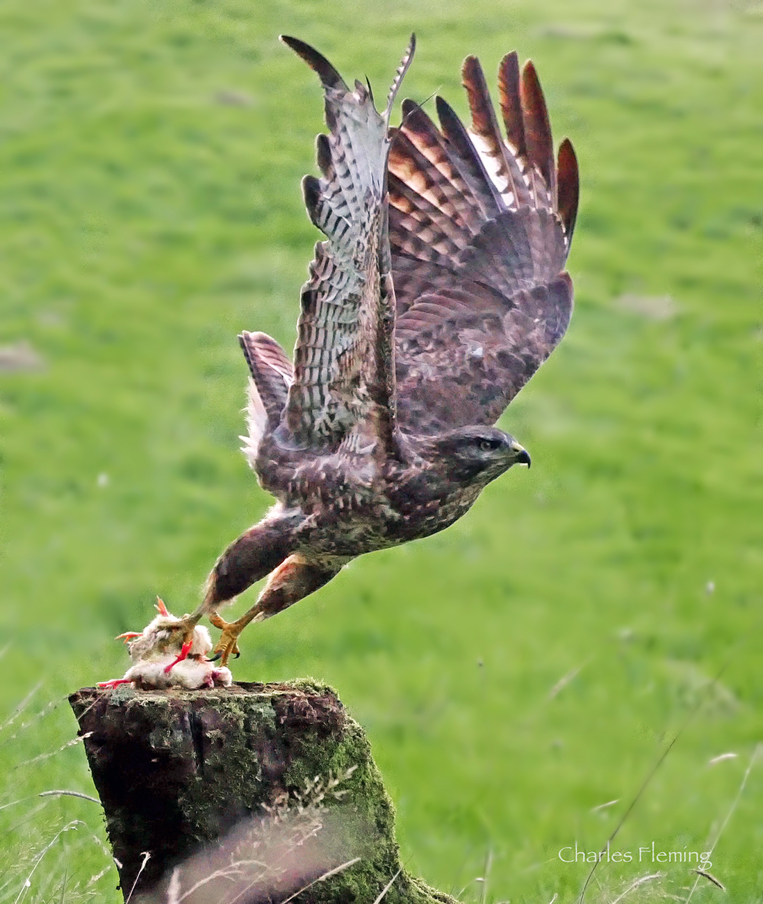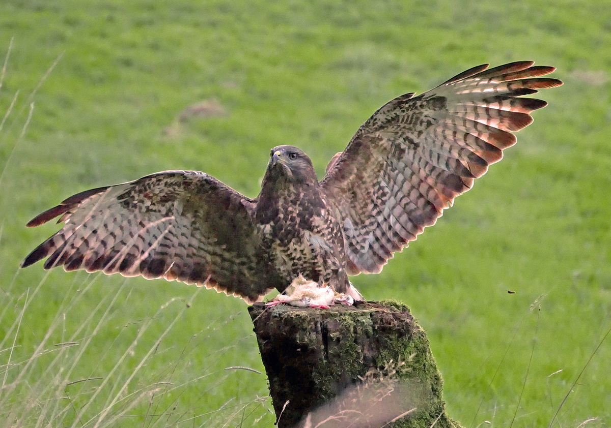 The Buzzards are now very accommodating and coming down to the bait much more quickly than they did previously which is exactly what i was hoping to achieve. I have discovered that they spend more time in the woodland than I had known. When they come to the bait they will quite often appear from a spot well under cover. Quite often they will fly low over the bait, then land nearby having assessed that all is safe. I have been trying to get shots of them flying in and out and yesterday I was quite successful.