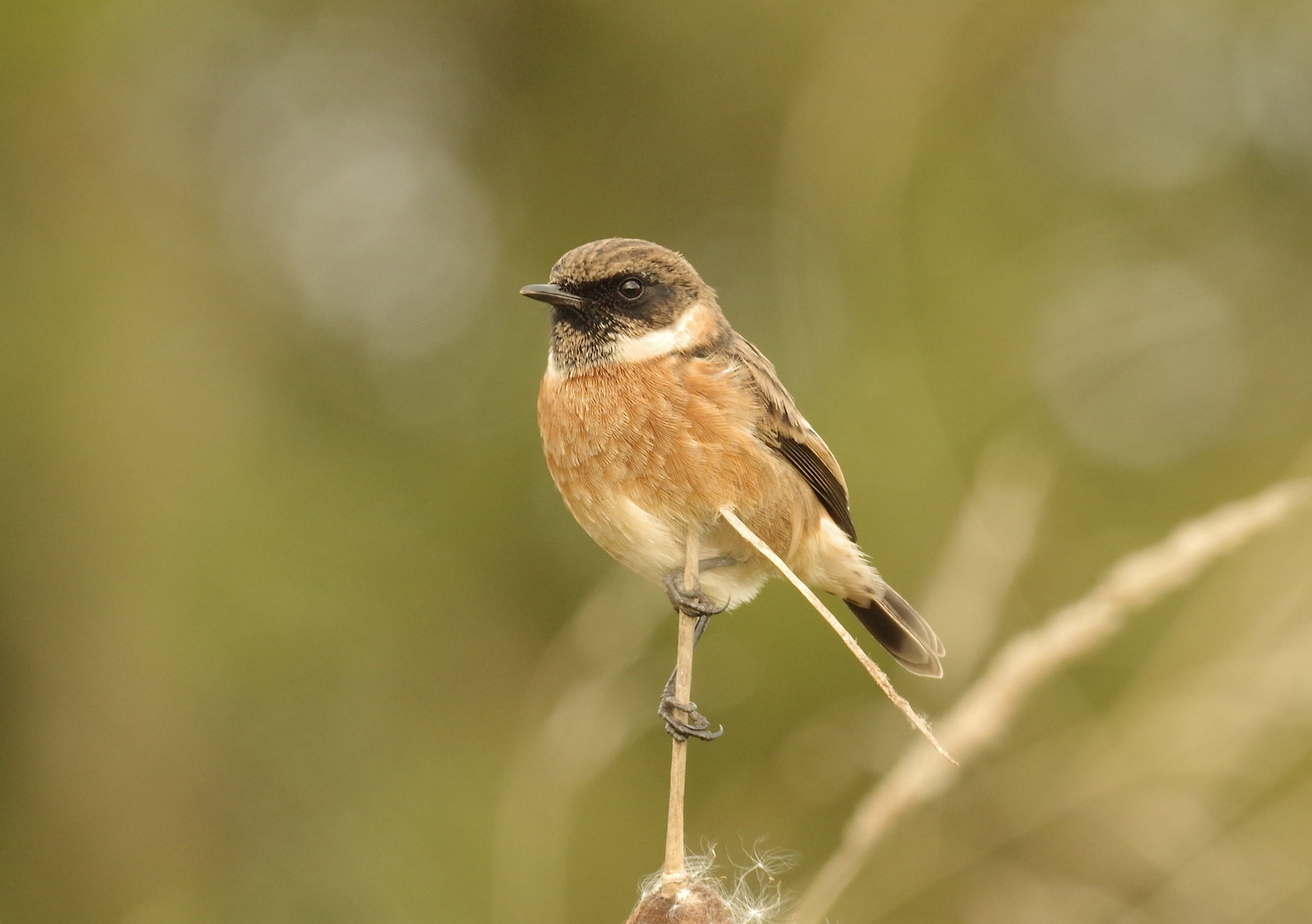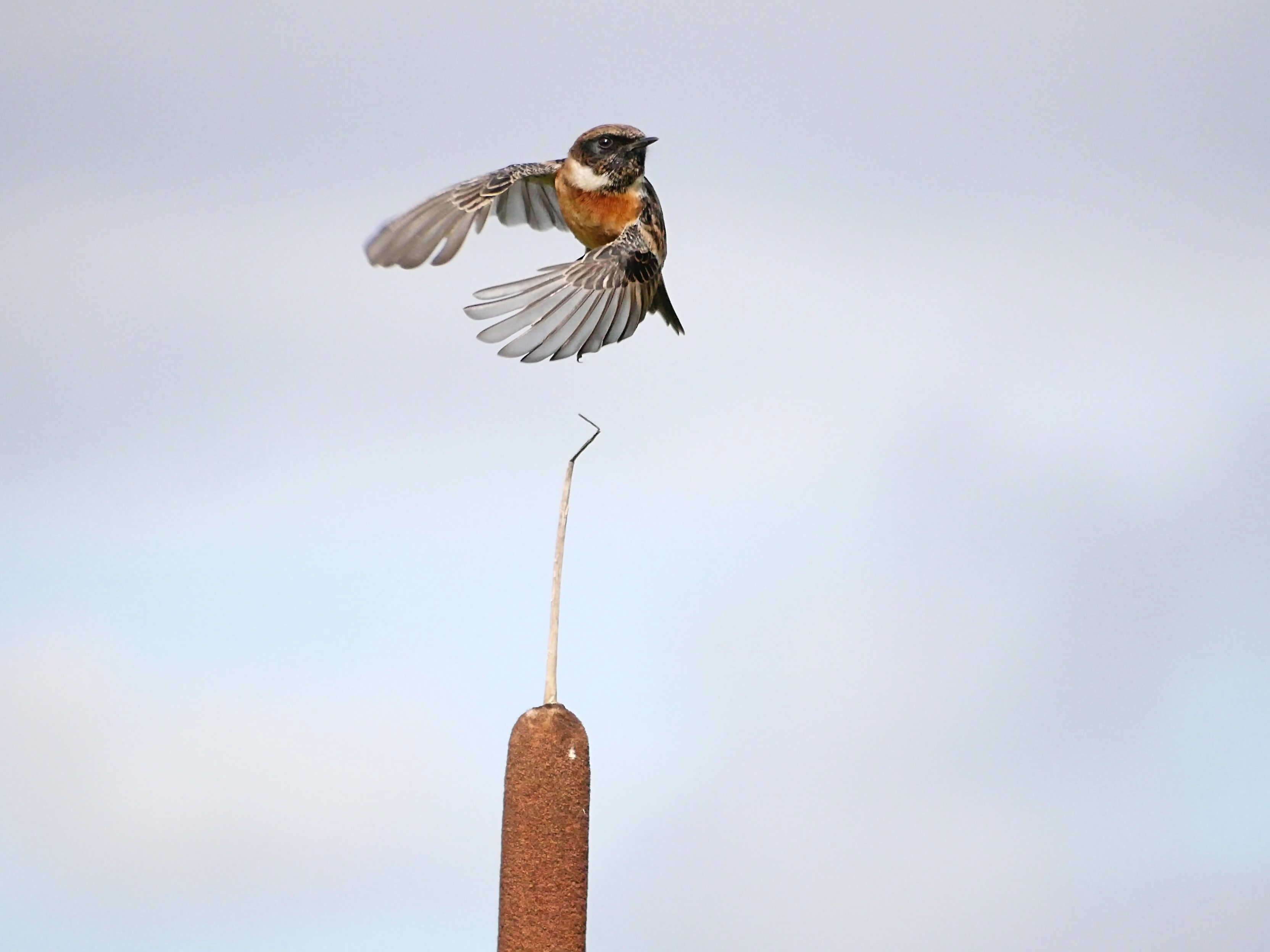 Apologies for not posting this last few days, my cataract is having a big effect. I have been out most days though but with varying amounts of success. I have been trying to photograph a Kingfisher locally, I sat and watched one very close up for around 20 minutes on Monday, I didn't have a camera with me which is Murphy's law, because when I returned the next day- twice – and then again yesterday, it didn't show at all? Nearby I saw that there was a pair of over-wintering Stonechat that were using the top of a reed mace as a look out point. They catch small flying insects such as hoverflies. I went and sat very close to the reeds and covered myself with my cam netting and it was just seconds before they came back again. I used both of my cameras to get both in flight shots and portraits – very successfully I might add.