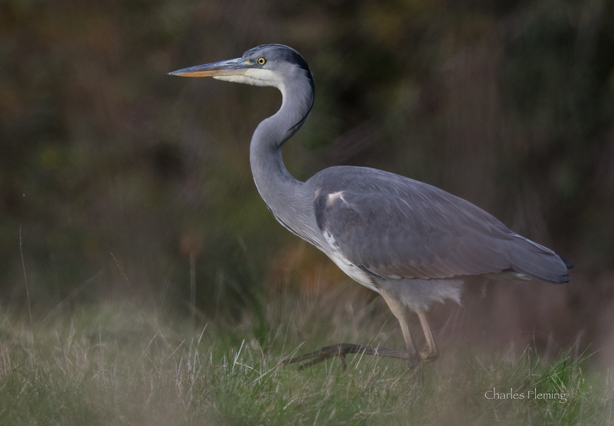 I absolutely adore Kingfishers as you may be aware. Over the years they have been quite an obsession for me. On the local brook in early autumn I had photographed an adult male – the resident this year - quite a tatty bird who was in a moult and had a claw missing, it looked as though he had experienced quite a hard breeding season but he would probably be looking quite good by now. The photo above is a female and she has led me a merry dance. I first saw her exactly 33 days ago and have been trying to photograph her ever since. Persistence and patience is something that I am quite good at but I didn't expect it to take this long to get a photograph of her. I was keen to photograph this bird because it would give me an insight in to the size of the territories of the Kingfishers on my local brook. In fact the nearest I had got to her was the first day I saw her, but, because of my cataract I couldn't tell whether it was a male or female. I didn't have my camera with me at that time and when I returned several times on the following days, expecting it to perch in front of my camera, it just didn't happen. I "ramped up" my quest and placed a heavy branch across the brook and was absolutely certain that any self respecting Kingfisher would not be able to resist it. Yesterday when I arrived, there it was on the perch as I expected but as soon as she saw me, off she zoomed. If I wasn't in tune with Kingfishers I wouldn't even have seen her, as is always usual with Kingfishers, she saw me first and flew off immediately. I was confident though that if I sat down quietly nearby and camouflaged of course, I would certainly be lucky. I saw her return but she didn't land on the branch and I was certain that she saw me, my camo wasn't good enough apparently. This called for some serious action! Using some dead Himalayan balsam and dock, I built a crude hide by pocking them in to the mud in a rough square and bent the tops over to make a roof. Then when I went back today I also covered myself with a back hide and I was pretty sure that this would do the trick. At first, after just 10 minutes or so, the resident and very wary Grey Heron flew in and landed in the stream just in front of me and I knew that the camouflage was working well. The Heron stayed for 20 minutes without finding anything to eat and eventually tried on the grass behind before flying off to try elsewhere but not before giving me some good photo opportunities.