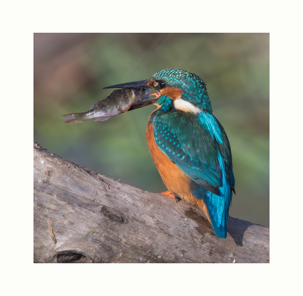I had some real success this morning. It's great when you don't have to wait very long as well. I had got myself settled in to the hide at 5 minutes past 11, a bit late I know but I needed to attend to a few things at home before I went out. I could see immediately that the light was brilliant, it was sunny and at this time of year, not too strong. I was expectant but not particularly optimistic because I hadn't had a great amount of success with Kingfishers here in the last few weeks. I fiddled with the cover of the hide and I was just making sure that I had a clear view from the front of the hide looking out on to the branch that I had planted there a week ago and then – I could hardly believe it – there was a Kingfisher and it had prey. I had been there just 9 minutes! I quickly focused on it and I could see that it was struggling with a really big fish and I realised quickly that it was a perch (Perca fluviatilis). In my 6 or 7 years of photographing Kingfishers with prey I have never seen one with a perch. I am quite sure that it had flown specifically to the branch here, I have known them do this before. This must surely point to the fact that Kingfishers are capable of cognitive thought or how else would it remember that this branch was here? A really solid branch is very important when they have large prey as they need to beat it to soften before swallowing. It would have known that the solid branch was there and flown from the nearby pond to this spot to deal with it's prey, I think that this is remarkable and I doubt whether any real study of cognitive behaviour in Kingfishers has taken place. The bird flying to the branch here is very good news for me, it means that there is every chance that the bird will return whenever it catches large prey again.