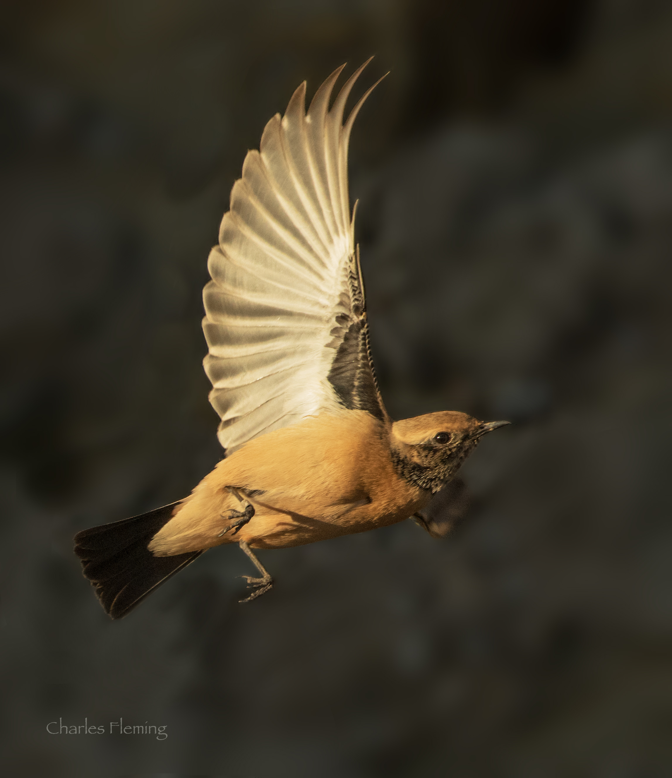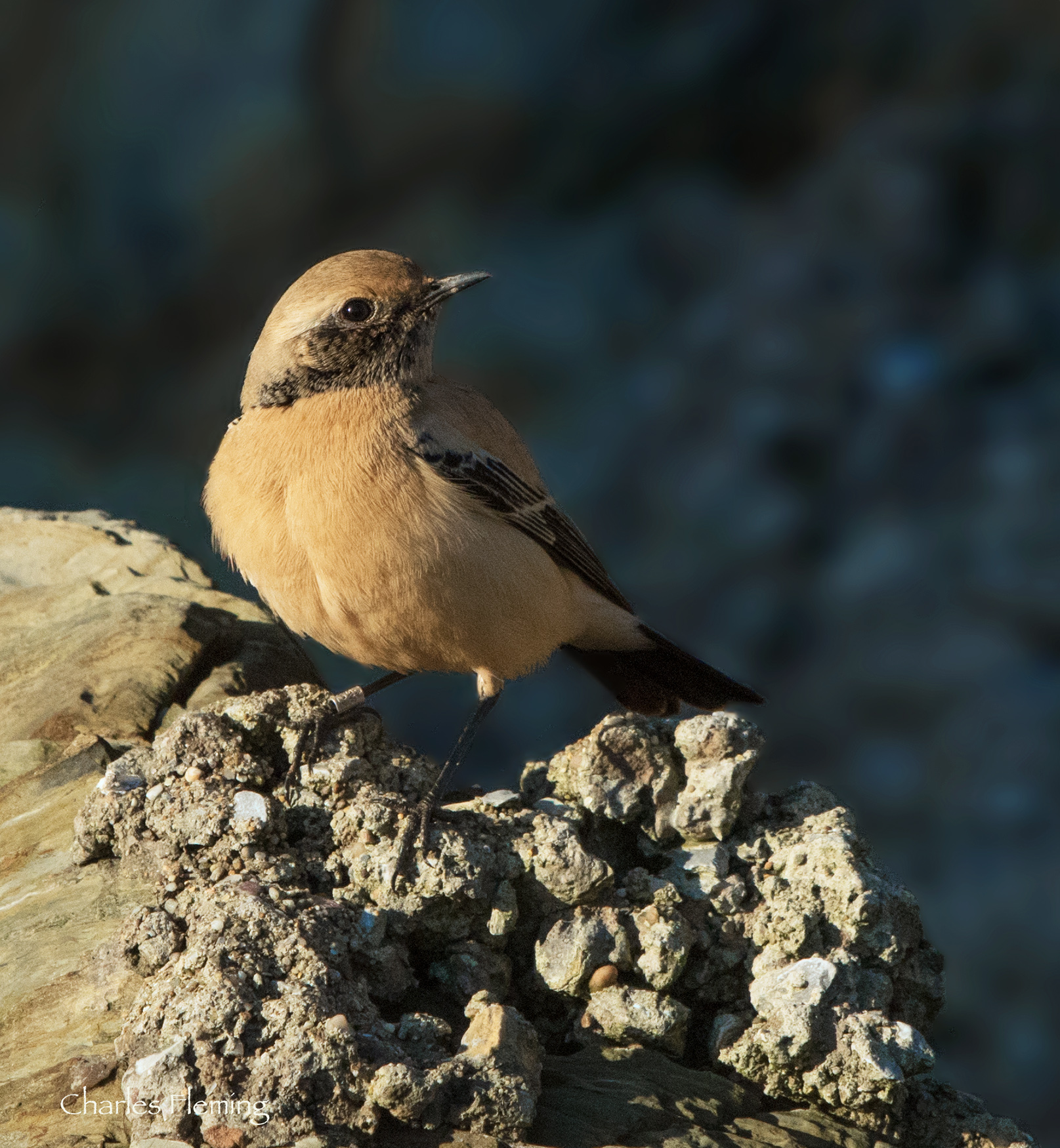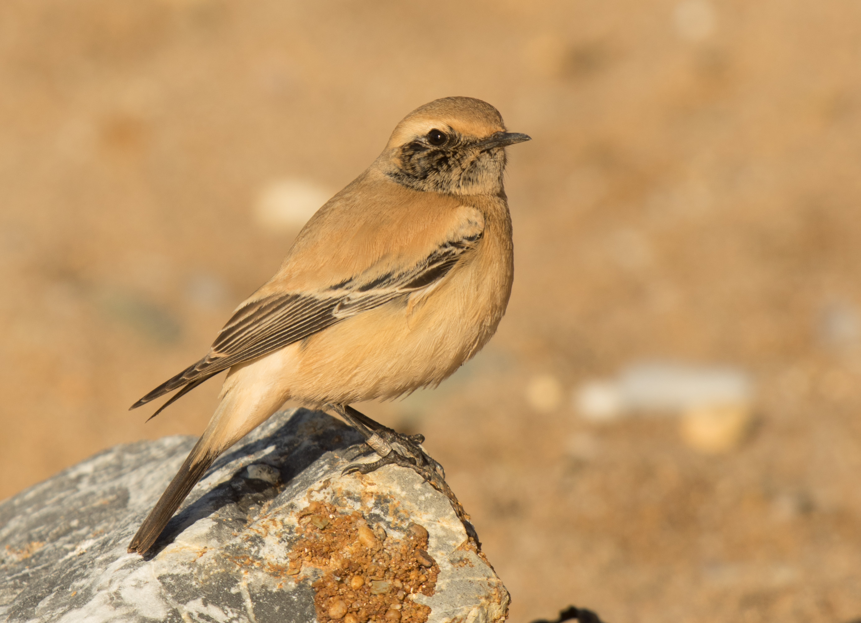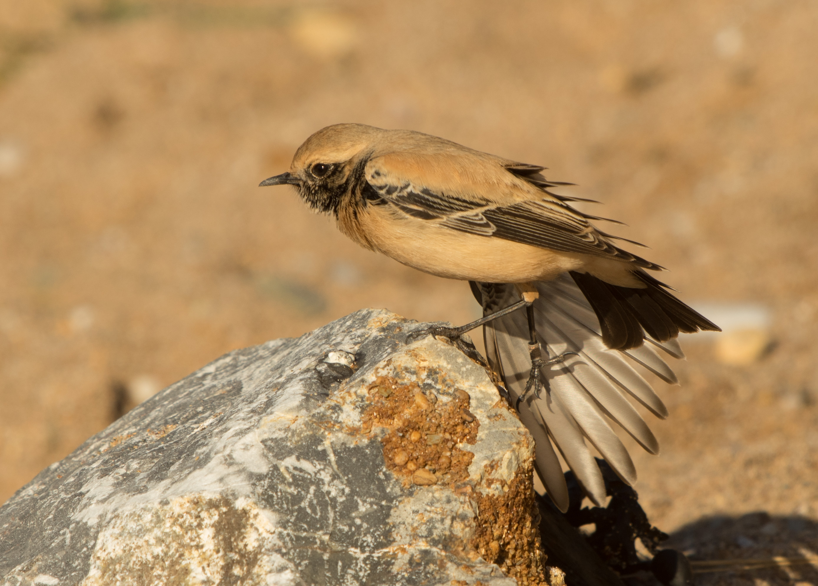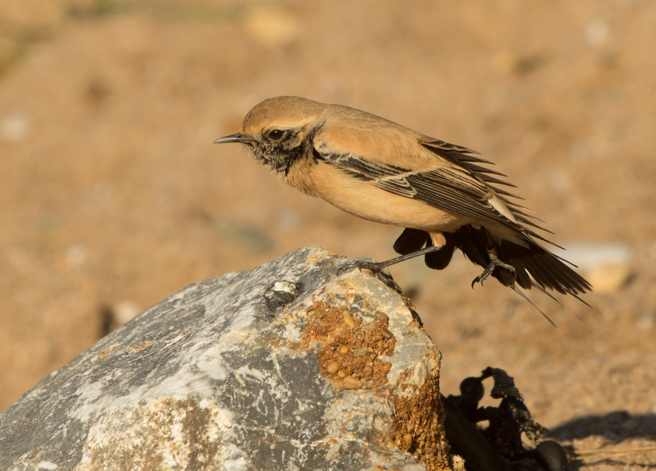 Desert Wheatears breed in the Sahara and also in the Deserts of Central Asia, all very harsh environments. They are migratory of course and this one should be with the rest of it's species in warmer more southern climes. It obviously got lost on it's Autumnal travels and finished up here in Devon where the beach and rocks are not all that different from the habitat that it left behind. What with rotting seaweed and warm rock cliff sides where insects are active, this is quite a warm and comfortable environment in which to over winter. It certainly was very active and finding lots of insects to feed on and also enjoying the free offerings of mealworms that someone had provided. Even though the overnight temperatures were low last night, by midday it was almost too warm for the heavy clothes that I had worn to make sure I wasn't going to be too cold as I stood around taking pictures.