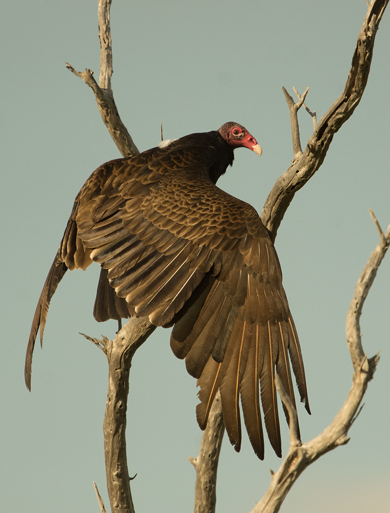 I sat for a couple of hours this morning in the hope that an Osprey would come and dive for fish in the the pool in front of me but without success. I have been told that they regularly fish in the spot at Whisky Creek but for the entire time that I sat waiting expectantly, a Turkey Vulture was in the trees opposite preening and sunning itself in the strong morning sunshine. Eventually it took off to look for something to eat no doubt. They are magnificent if not a little bit ugly and their plumage is really quite attractive to my eyes, not to mention their spooky looking bare face and strong hook beak. I have just read that they are no way related to the Old World vultures but just resemble them because they feed and act in the same way. a prime example of convergent evolution. I am very fond of that phrase and quite often quote it, now I know of a good example.