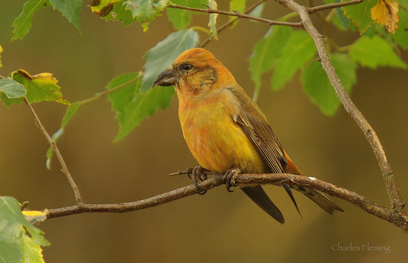 Above, a sub-adult male showing juvenile un-moulted feathers on the head which are yellow. When newly fledged crossbills undertake their first mount, regardless of sex they acquire greenish/yellow plumage, and it is not until next moult that males acquire redish plumage. This bird shows this really well and in addition the edges of the secondary feathers are retained and bleached to show as a wing bar.