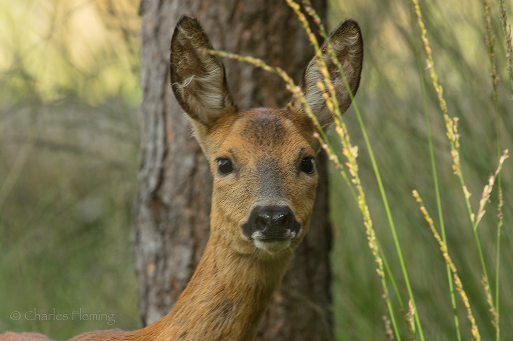 The European roe deer (Capreolus capreolus) is now a common species here in the UK. When I was growing up in the 1950's they were rare and now it always excites me when I see one. Whilst trying to photograph the woodpeckers in Haldon Forest recently, I have regularly encountered them and I decided to make an effort to get some good photographs. I purchased a Buttolo call which is basically a squeaky toy that imitates the voice of the Deer. I had seen this on You Tube and it looked very promising. When the package arrived in the post I couldn't wait to try it out. I was quite optimistic but sceptical to be honest, but I had nothing to lose. I arrived in the forest yesterday morning and as luck would have it a deer was in the distance feeding amongst the long grass. It popped its head up and I froze and then managed to tuck myself behind a stout tree. The doe carried on feeding and with the wind blowing towards me everything was fine. It was time to use the Buttolo call! The first squeak made the doe immediately raise its head and stare in my direction but when I repeated it she put her head down and seemed to ignore me, disappointment! I carried on as per the instructions and what happened next was staggering. Suddenly another doe appeared bounding through the long grass and over the dead branches towards me. Then very purposefully she continued in my direction. She kept coming and kept coming until she was literally just 10 feet from me. She had been attracted to the call which had been imitating a young fawn, they are left in the long grass by their mothers when they go off to feed. Being this close to the doe was a lovely encounter. It made me realise how vulnerable they are and how easy it would be for a poacher to do his worst. I took some lovely frame filling shots with the camera that literally filled the frame as the doe realised I was there and bounded away to relative safety and disappeared from view.
