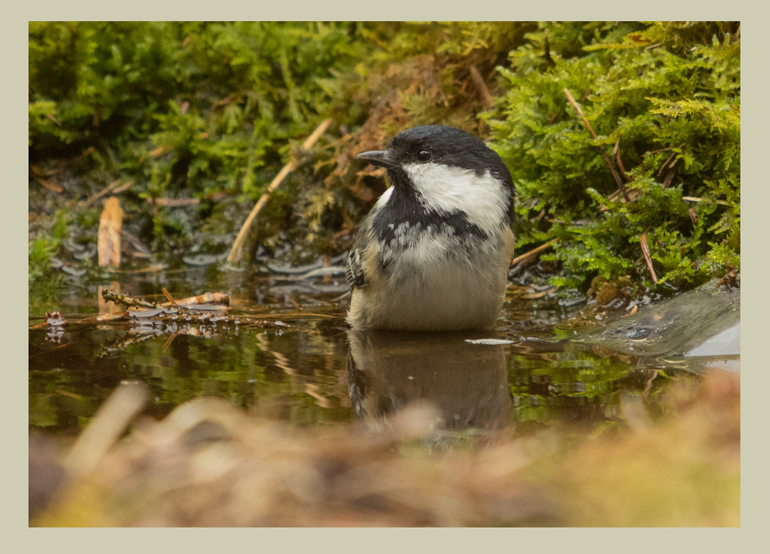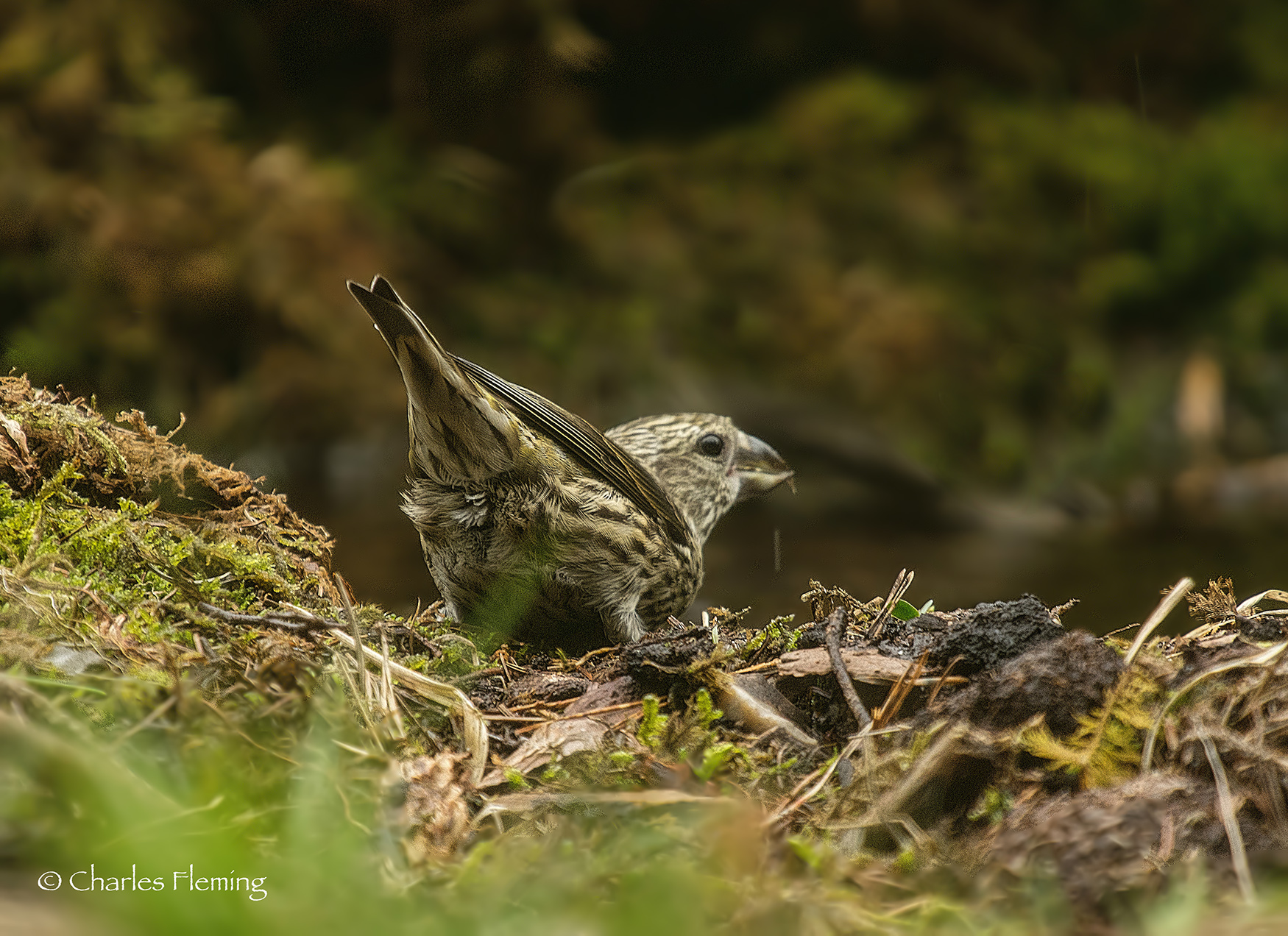 Way back in July I created a drinking pool in Haldon Forest to try to get the forest birds to come there to drink. There is a small population of Crossbills resident there but they are virtually impossible to photograph unless you make some plans and preparations. I have been trying for around 8 weeks to entice them to use the pool. Crossbills are entirely seedeaters and the only real opportunity to get close to them is when they come to the ground to drink. However, this late summer and early autumn has been really wet and we have hardly had it dry enough for any other standing water to dry out which would leave "my" pool as the only drinking source. After a few days without rain, today seemed to be a good one to go and "stake out" the pool. As soon as I arrived and after disturbing 4 Roe Deer just by the pool, I sat in the hide next to it and heard Crossbills very nearby noisily moving in the conifers all around me. I had a really good feeling about my chance of success but with quietness returning very quickly, my optimism started to fade. After an hour, suddenly a Coal Tit landed in the pool and I took a few photos. Then bingo, after 8 weeks and perhaps 50 hours of trying, there in the tiny pool was a small family group of drinking Crossbills including one adult male, more than one female and juveniles. They drank quickly and after 15 seconds or so, all of them lifted off from the pool and the encounter was over. I managed just one half decent photograph!