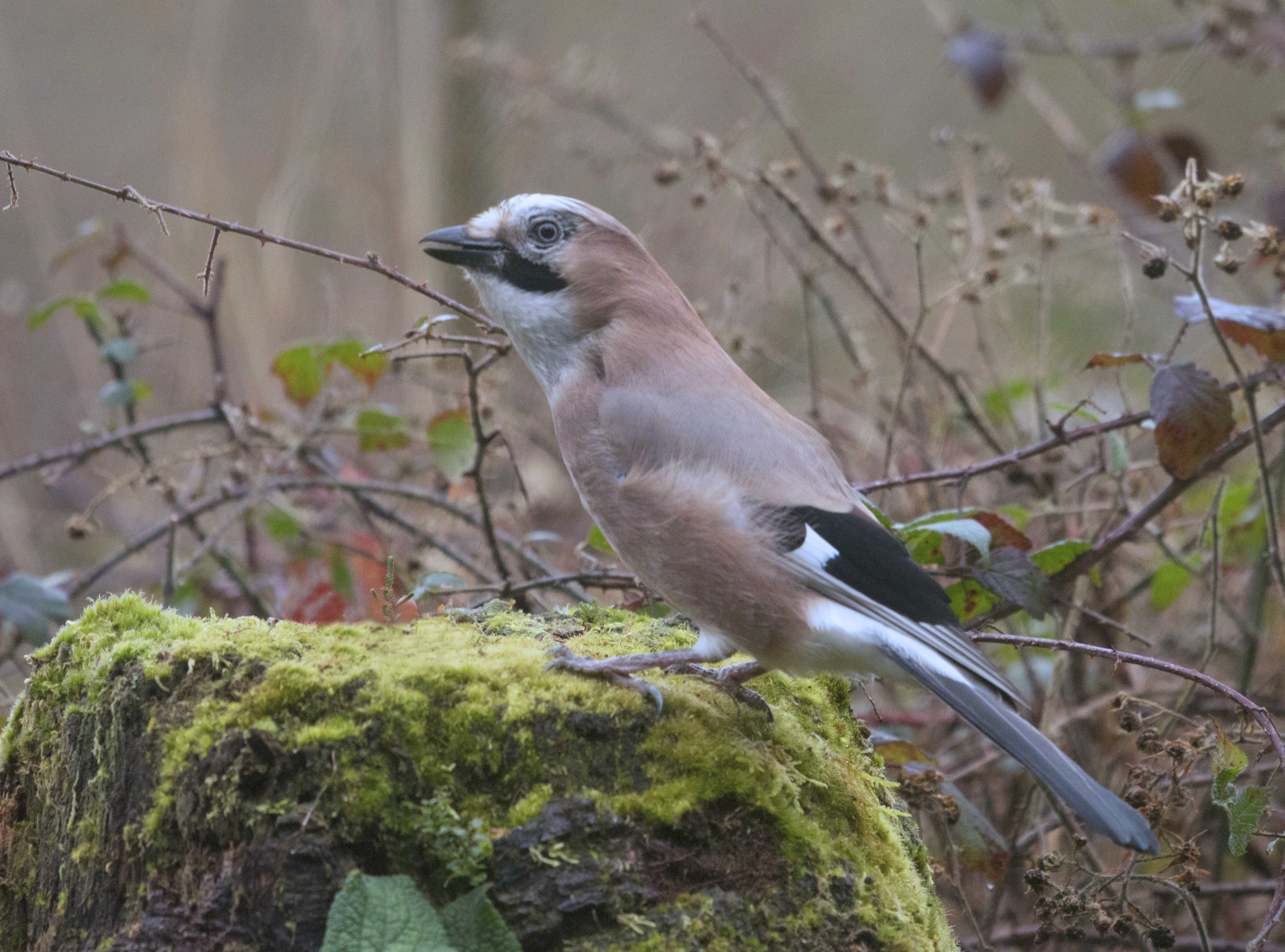 The Jay is a really colourful member of the crow family. They are, however, cunning and intelligent in equal parts. I was sat today, well concealed in some cover trying to discover and then photograph the bird or birds s that are responsible for eating the apple that I have been putting out on a log in Haldon Forest. I suddenly heard an unusual, quite musical call that I wasn't familiar with and I was expectant and hopeful that whatever it was would come down to feed. Then, it was only seconds when suddenly this Jay landed on a log just in front of me. I love to see this species, they are stunning birds. What had happened was not unusual. Jays are great imitators and regularly copy the calls of other birds. Quite what species this one was imitating I am yet to find out but it was another very interesting encounter and worth sitting there in the really cold and miserable conditions. It grabbed a crop full of peanuts before flying off again to stash the nuts which is what they do. They are known to actually remember hundreds of places where they have stashed food, usually acorns incidentally. Some acorns get missed and this is a way that new Oak trees grow. I went back up to the woods just before dusk to see if anything had taken the apple and yes, it had but still not while have been there. Perhaps tomorrow? However, it was just simply lovely to see a little group of Roe Deer, including one of this year's fauns feeding on Bramble leaves not too far in front of the hide. A great end to my day.