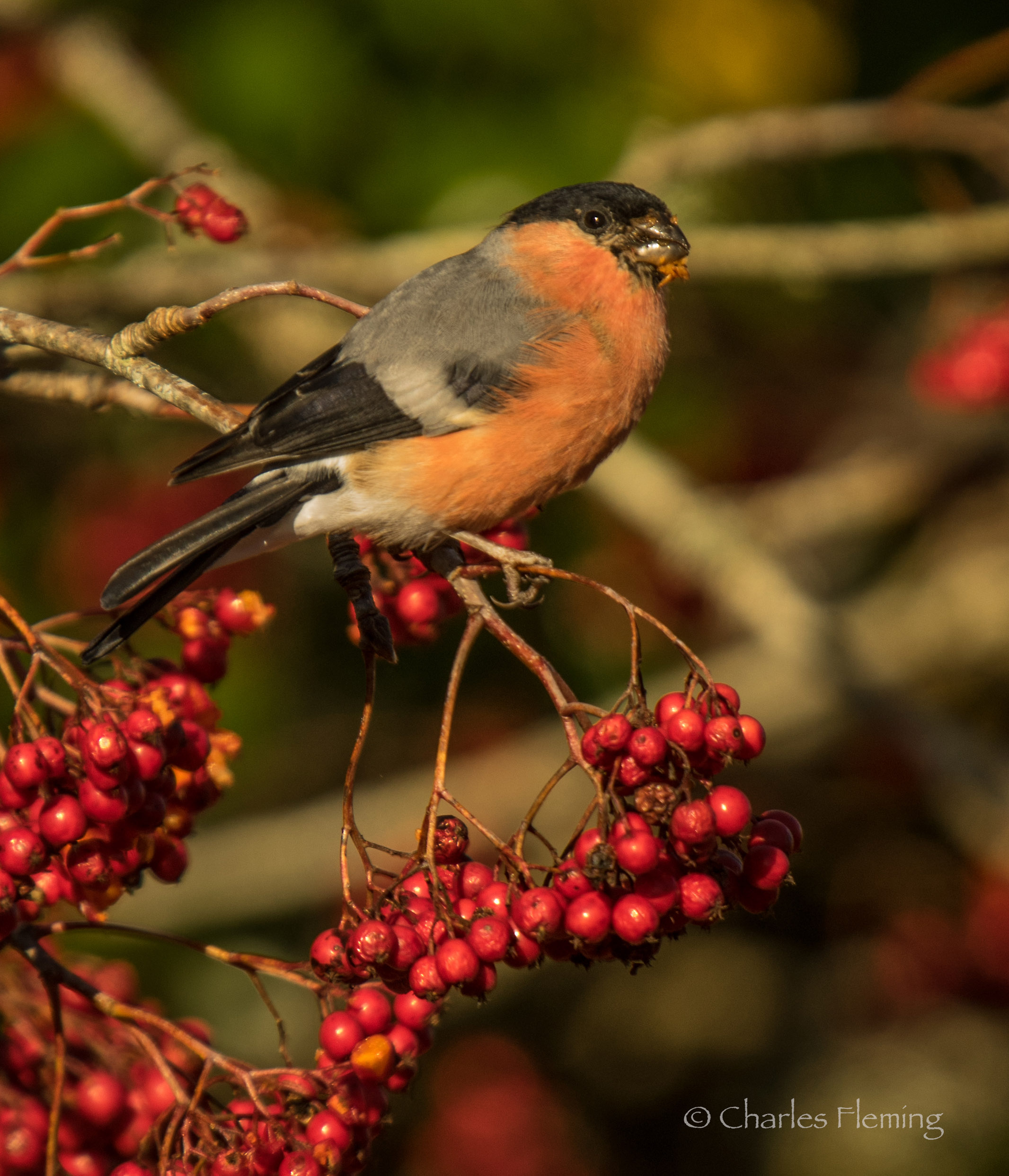 We have been for a couple of long walks this weekend. One from Powderham to Cockwood on Saturday took us through Starcross. I would love to live there by the way. As we walked, we were lucky enough to see Bullfinch on two occasions, both times they were feeding on roadside berries. You can always tell a Bulfinch – probably more common than you realise – by the flash of white rump which is always really obvious in both the male and the female and also in juveniles, but by now they will have acquired their adult plumage. It's a sweeping statement but the Bullfinch has got to be one of our prettiest small birds. I have a real soft spot for them. When I was a young pre-school child my dad would take me for walks to find their nests in rural Derbyshire and it's one of the first birds I was aware of. He used to breed canaries and it was usual to also pair your canaries with British Finches way back in the 1950's and I recollect that he would put the odd egg under his sitting canaries. It was different days then and still legal to collect birds eggs until 1954. Thank heavens it's illegal now.