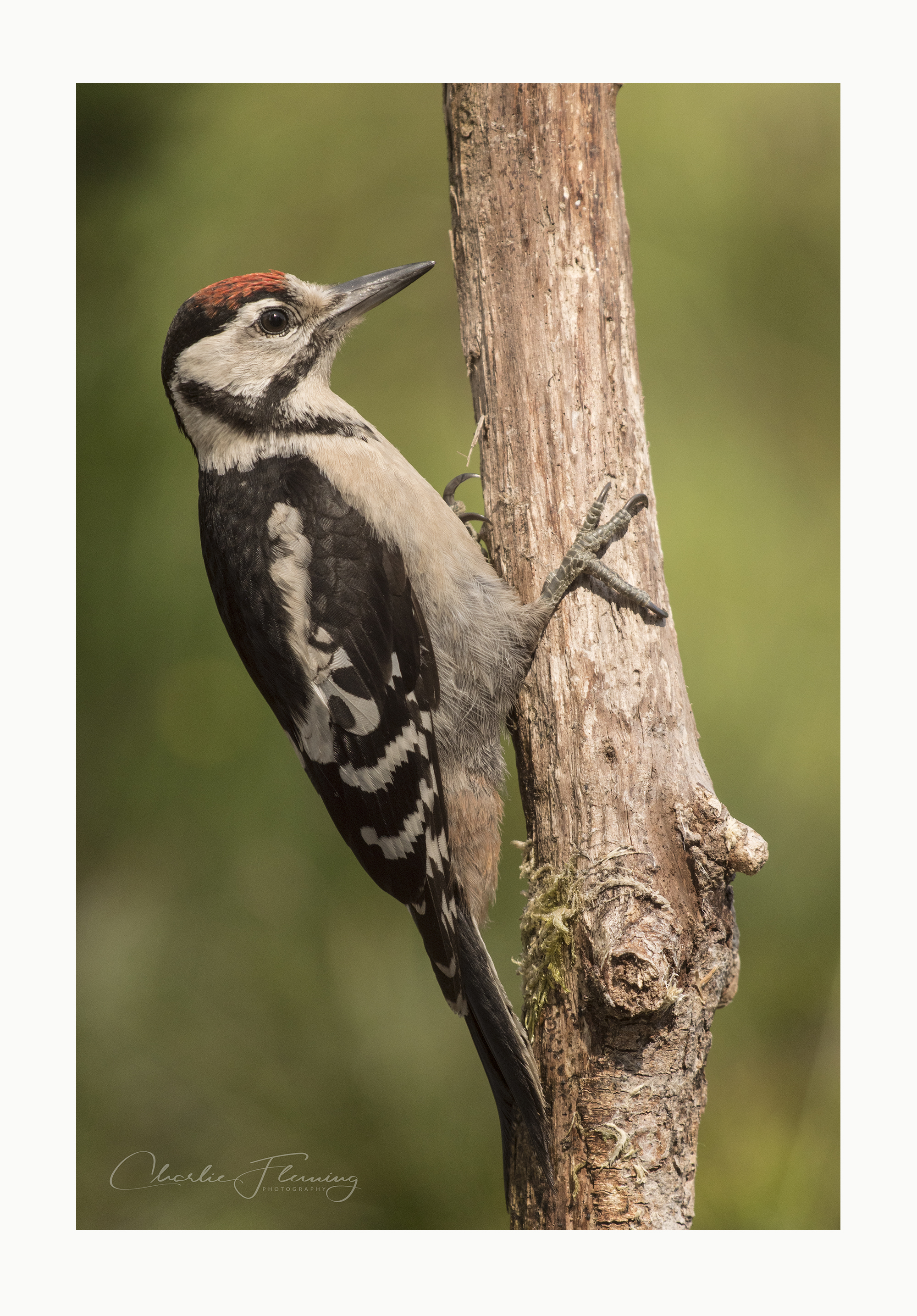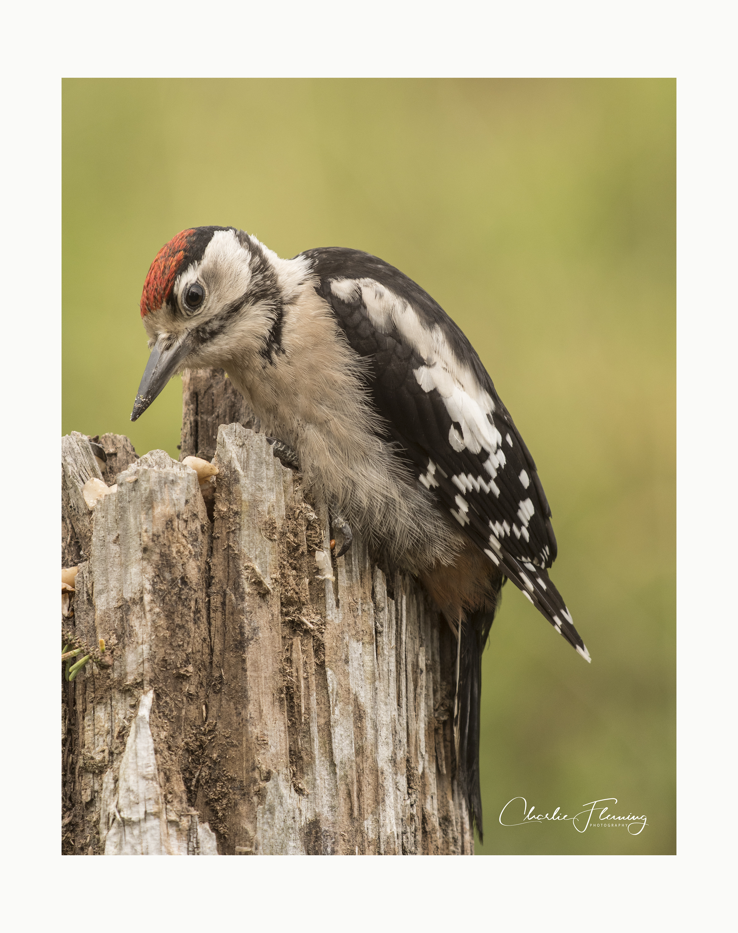 As you can see, juveniles do not have bright crimson red feathers around the vent as adults do, instead there is just the vaguest hint of red, however, they are still one of our most colourful birds with bold black and white markings on the wing which flash when they are in flight.