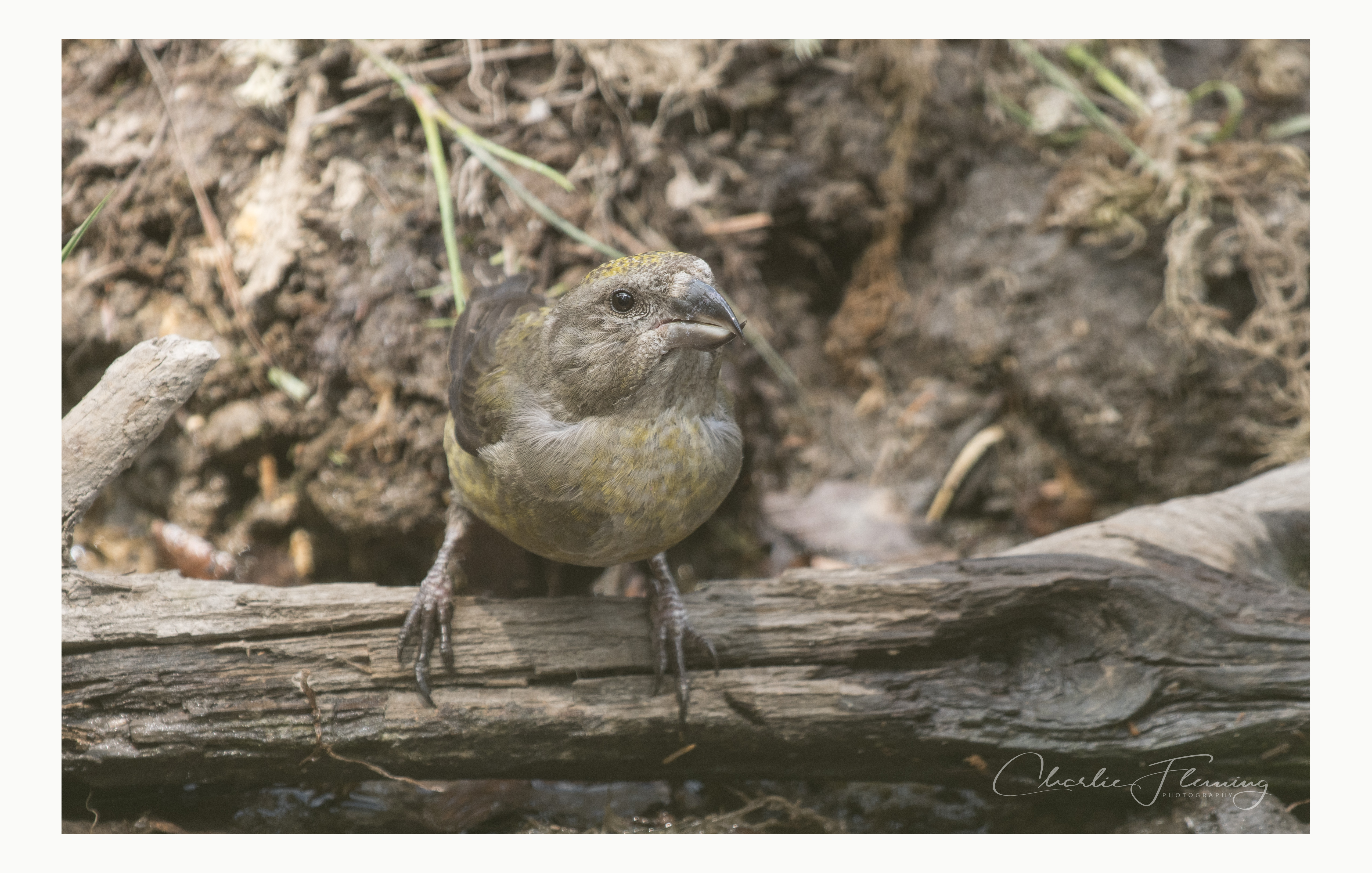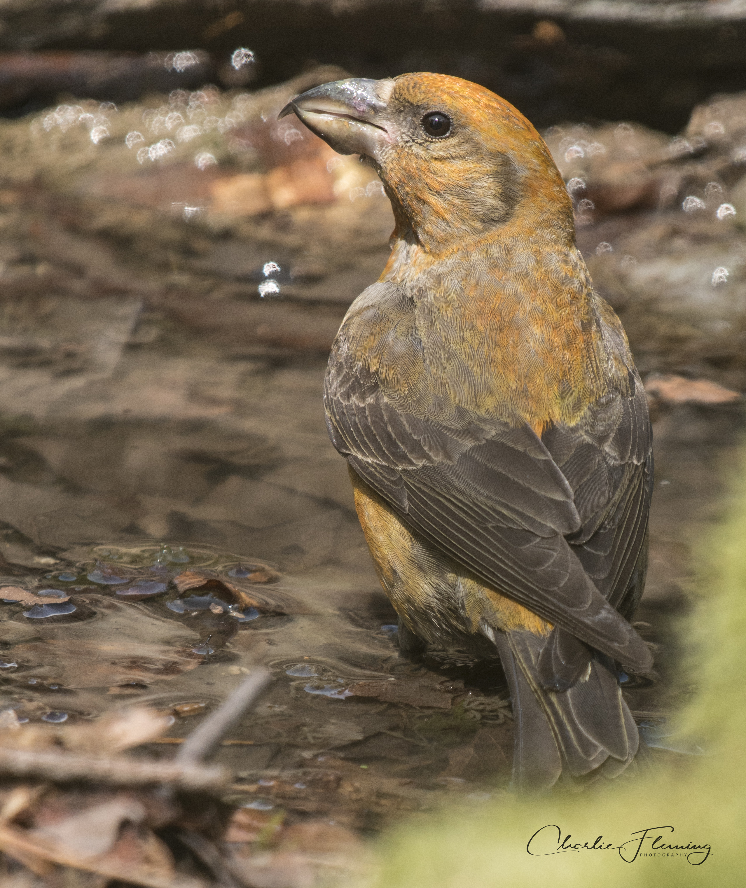 It is interesting when you look closely at a Crossbill to see that the beak crosses either from the left or the right. This gives you the opportunity sometimes to separate individuals. For example, I don't think that I have seen this bird drinking from my pool before because the previous male birds photographed have had beaks crossing from the other direction. I have read that there is no pattern to this and birds in the same nest can be either lefties or righties! There is probably a gene involved and a pattern of inheritance could probably be worked out. Mendel's theory of genetical inheritance is not difficult to grasp. For example, some traits can be "sex-linked" meaning that females – in some cases – can carry the gene but only males will show the characteristic or visa-Versa. Other rules are either dominant or recessive. I don't believe that any study has been carried out to ascertain what the pattern of inheritance for left or right beaks is? It could, however, just be random, who knows? This bird (below) is the partner of the male and her beak crosses to the right as well.